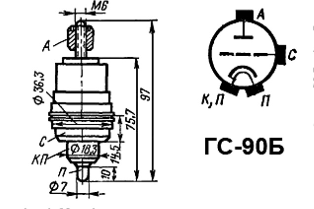 Генераторный триод ГС-90Б для генерирования высокочастотных колебаний дециметрового диапазона в непрерывном режиме работы в генераторах с внешней обратной связью.
