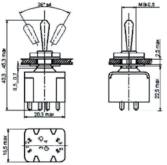 ПТ6-11В переключатель тумблерный, применяется для коммутации цепи сигнализации, питания и управления с напряжением 1х10-4В - 250В, силой тока 1х10-6А - 16А и коммутируемой мощностью до 1900Вт. Тумблеры выполняются с рычажным приводом, позволяющим укреплять резиновый защитный протектор и так и без него. В зависимости от фиксации рычага тумблеры выпускаются с фиксацией в трех положениях, в одном крайнем и среднем положениях и только в среднем положении. Монтаж проводов проводится пайкой.